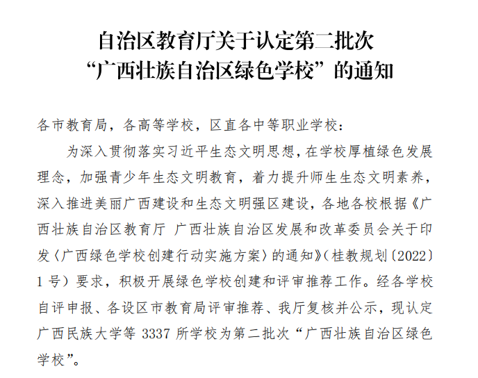近日,根据自治区教育厅发布《自治区教育厅关于认定第二批次“广西壮族自治区绿色学校”的通知》(桂教规划〔2022〕9号),我校获评“广西壮族自治区绿色学校”荣誉称号。这是自治区教育厅对我校长期以来践行生态文明思想、大力推进素质教育和精神文明建设等系列工作的重要肯定。
