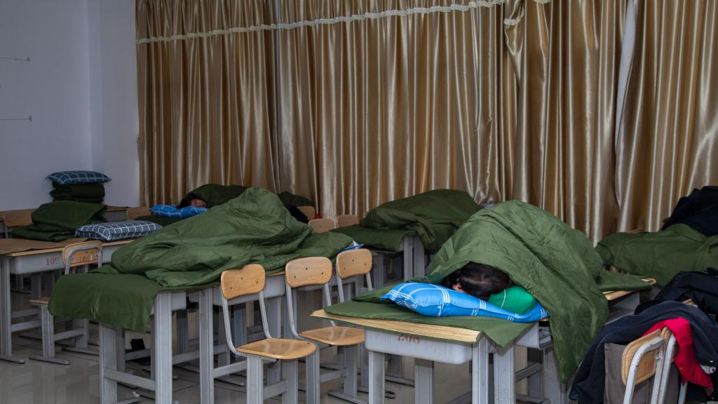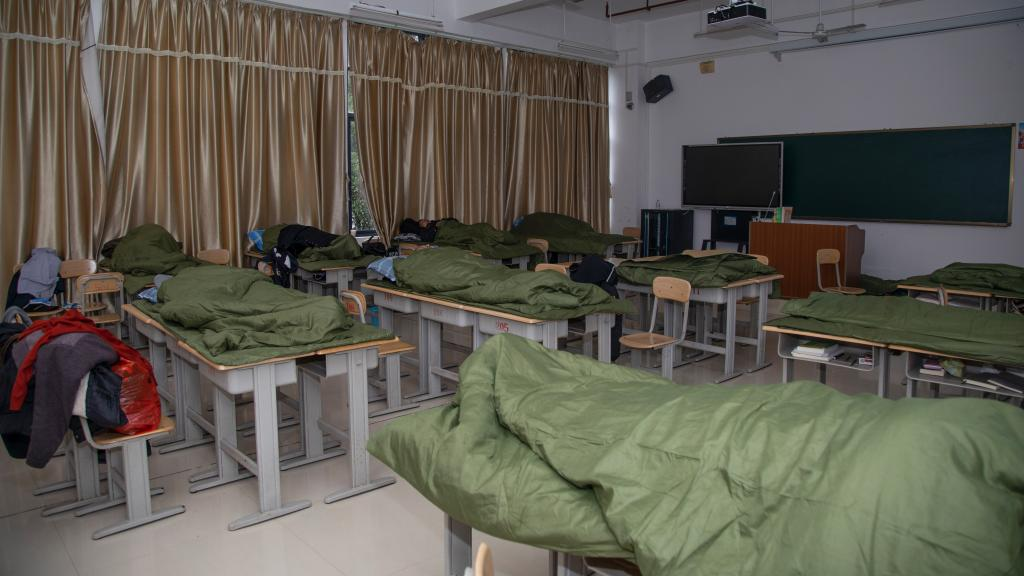29日以来,57名物业保安因疫情封控需要,休班后不能离校回家,晚上只能在格致楼的教室用课桌搭建临时休息场所。(文/罗冬雨 图/肖佳 吴海娇 罗冬雨)