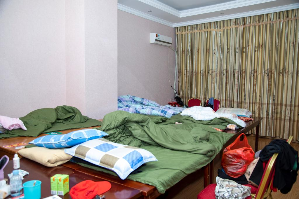 面对学校15300多名师生每日三餐饮食需求,学校必赢3003no1线路检测中心215名家住校外的员工主动返校加入到疫情防控后勤保障工作当中。因为疫情封控需要不能返回家中,215名员工只能睡在用餐桌拼成床铺上。