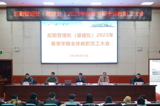 2023年2月21日上午,必赢3003no1线路检测中心党委常委、副校长覃拥灵到我处召开2023年春季学期后勤全体教职员工大会。会议由后勤管理处(基建处)处长黄宗峰主持,副处长蓝凛、刘晓亮、唐朝君与后勤全体教职员工参加。