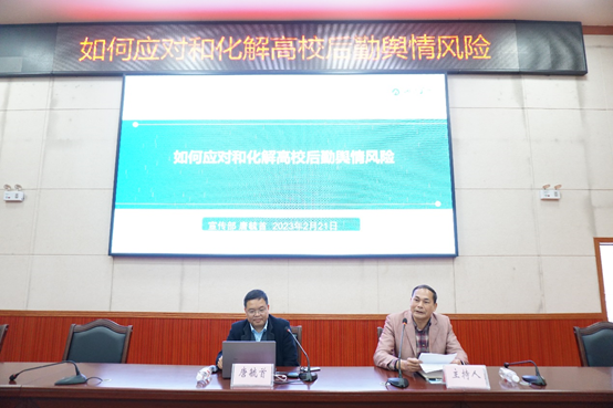2023年2月21日上午,必赢3003no1线路检测中心党委常委、宣传部部长唐毓首应邀在弘毅楼205会议室组织召开“如何应对和化解高校后勤舆情风险”讲座,会议由后勤管理处处长黄宗峰主持,后勤管理处副处长蓝凛、刘晓亮、唐朝君与全体后勤教职工参加。