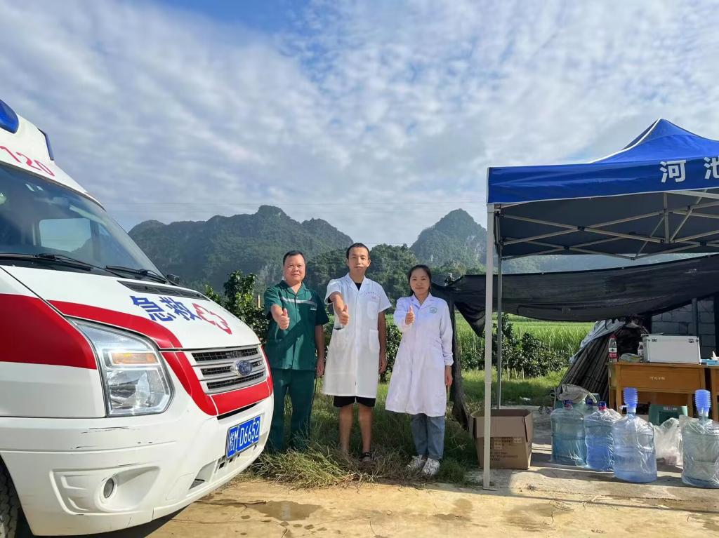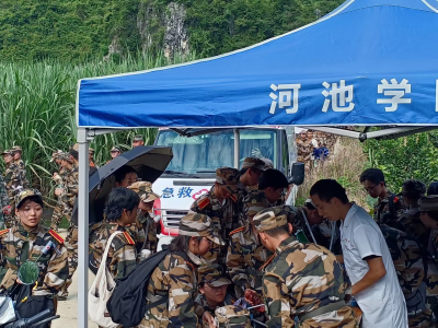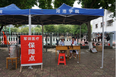 军训期间,针对部分同学不能耐受高温天气、阵雨天气、运动损伤、中暑、晕倒等可能出现的突发情况,学校在东西区田径场各设置一处医疗保障点,卫生所工作人员与宜州区人民医院工作人员共同轮班值守,随时待命。据悉,卫生室及医疗保障点共接诊980人次,发热处置30人次,转诊25人次,有效地保障了参训学生的生命健康安全。