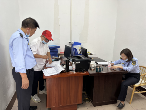 河池市市场监督局执法人员正在查阅食品供应台账
